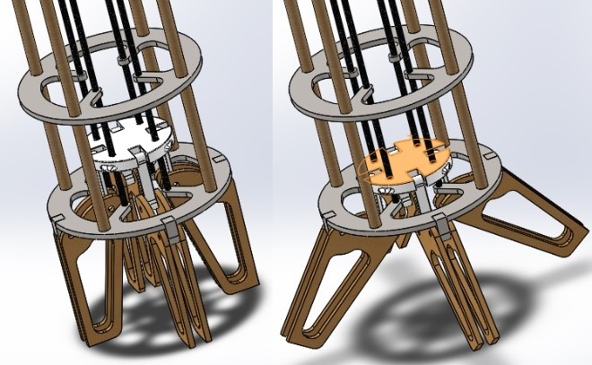 Figure 3. Base model of design #1, unoptimized, configured for test rocket. Left shown closed, right shown open