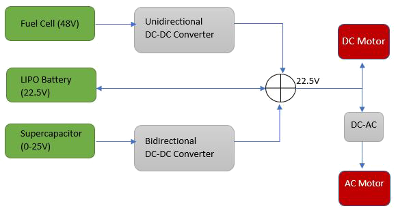 and consist of the following: hydrogen fuel cell, a LIPO 6s battery and a supercapacitor.