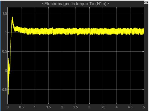 As the report mentioned, the stator current and rotor current have to be a sine wave because of AC motor, and the zero to peak current for both stator and rotor current are 7.4Aac (figure 14). In a physical application, the team could choose a motor of rated current greater than 7.4Aac without risking a burn-out of the motors. A motor running at an initial condition of 1500 rpm, when adding a load, results in a rotor speed drop to 1437 rpm (figure 15). As the report indicated before, a no load rotor speed should be the maximum case. The nominal value of torque is 1 N*m (figure 16), the simulation results match the nominal torque. The Beta prototype simulation results have been validated and accepted.