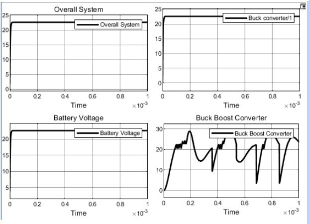 Using the reading in figure 13 , it has indicated that the overall system has achieved the main purpose, having an overall voltage around 22.5V. The buck converter has managed to step down the input from the fuel cell at 48V to 22.58V, which is within the 0.35% of the desired voltage level.