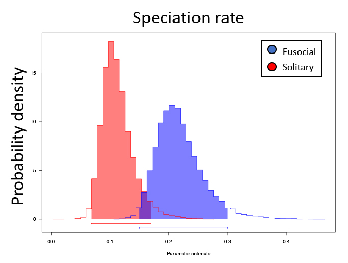 State Speciation and Extinction (SSE) methods allow us to observe if a species is evolving at a different rate than it’s related taxa, but more importantly allows us to predict if a trait is responsible for driving the differential evolution rate between species. Halictid bees, or ‘sweat’ bees, are an ideal model for studying the transitions between solitary and eusocial reproduction. Eusociality has been gained and lost repeatedly in this group, and as a result, closely-related halictid species span the full spectrum of social forms, from solitary to eusocial. I am interested in studying if the transition from solitary to eusocial reproduction, or the converse transition from eusocial to solitary reproduction, has an effect on genetic diversity, population structure, and in particular, speciation rates. I tested if eusociality is driving state-dependent diversification rates using State Speciation and Extinction (SSE) methods across the larger phylogeny of Halictidae. The phylogenetic comparisons indicate that eusociality is associated with higher rates of speciation than solitary reproduction, a result that is is robust across likelihood-based and non-parametric SSE tests as well as hidden state models.